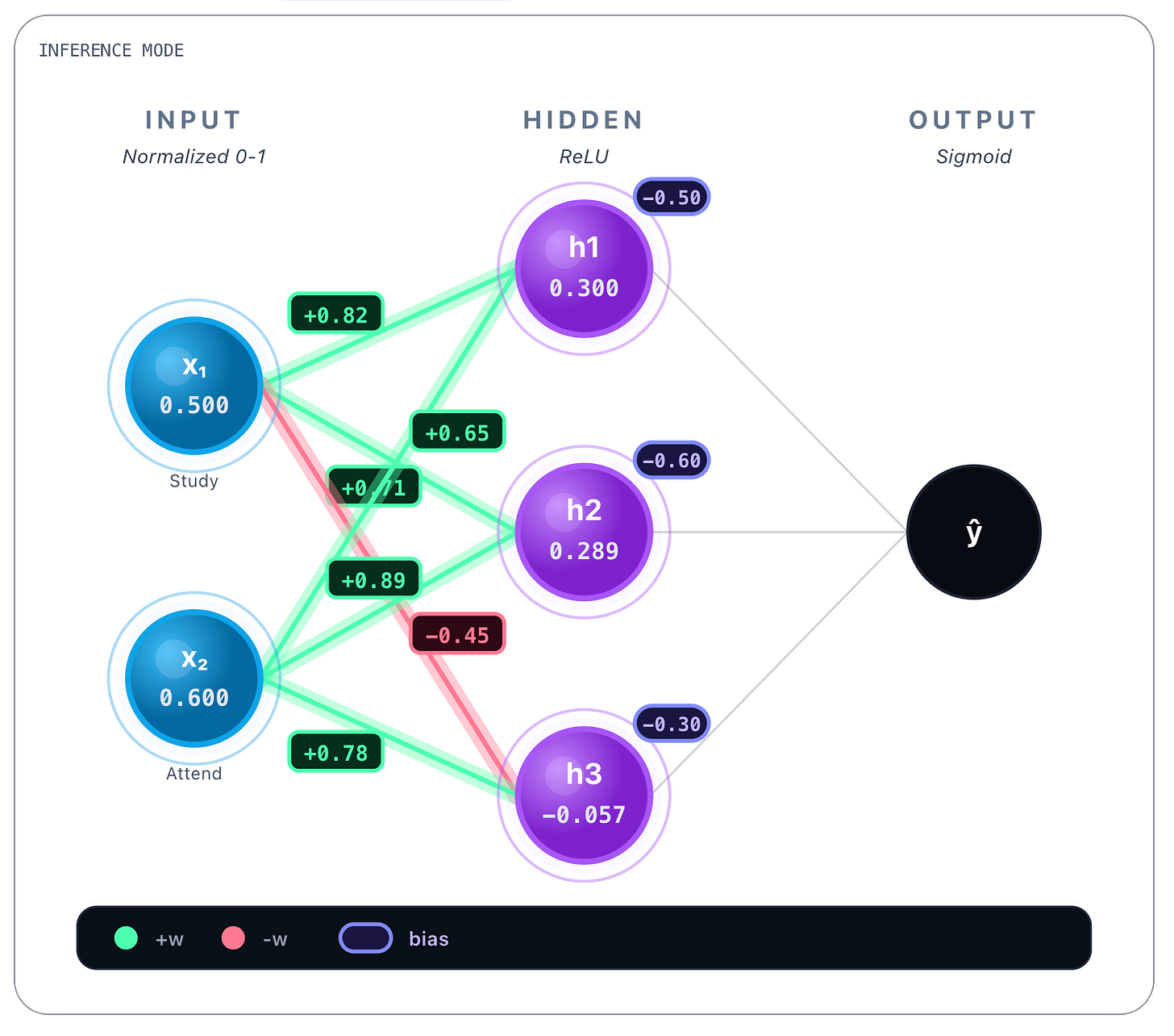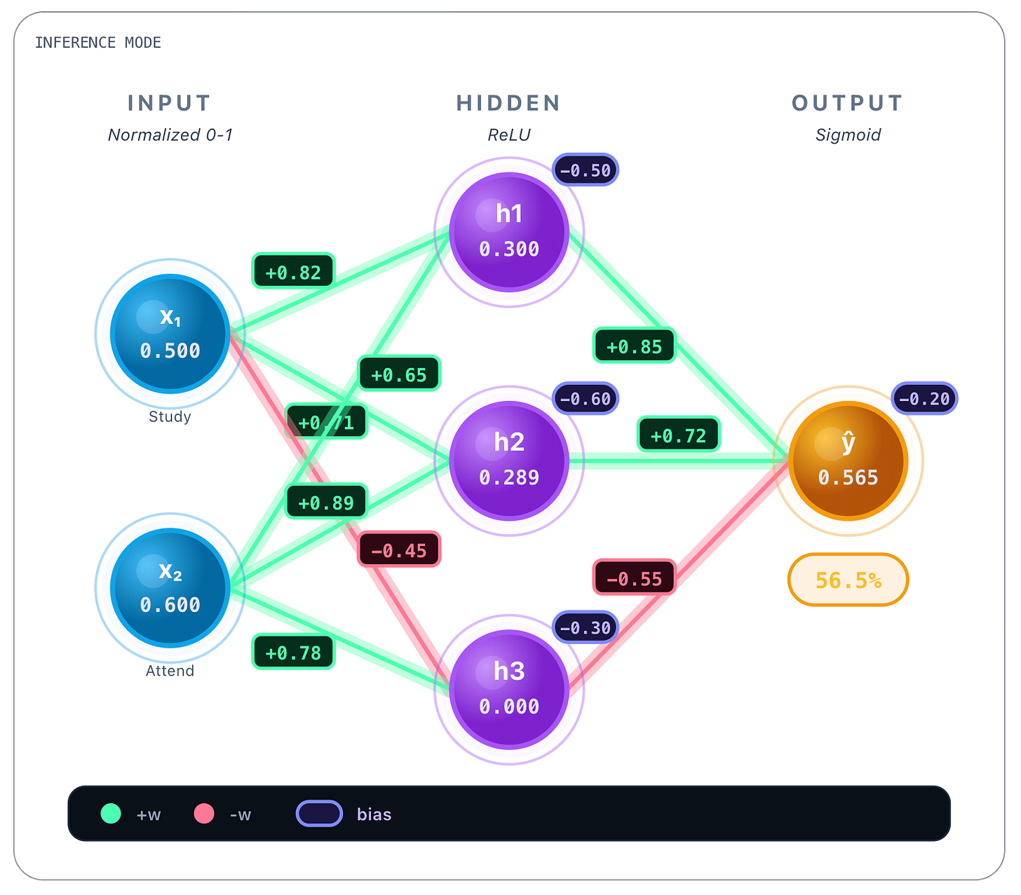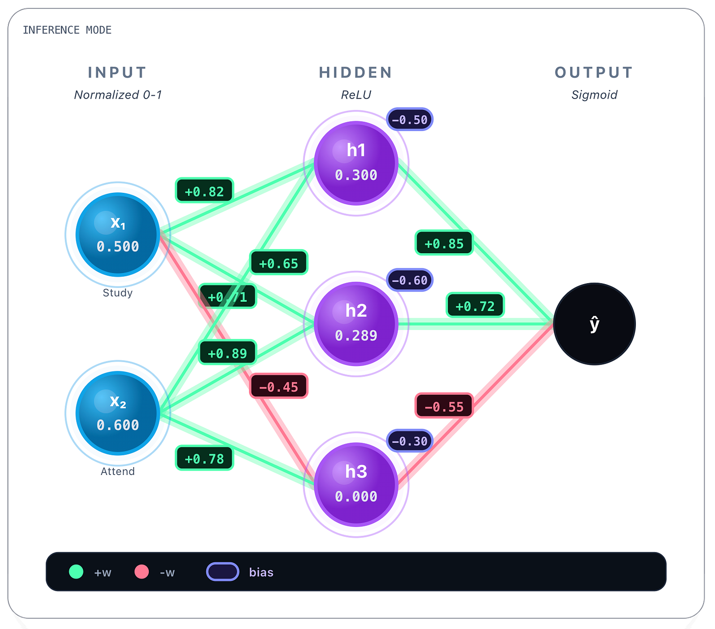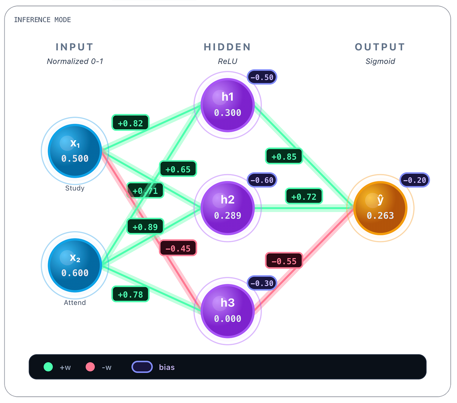 → h₃: w = 0.78These values were obtained during training and are static once the network is trained. Whatever the inputs, these values are always the same. Bias values are also learned and static, we show them next.