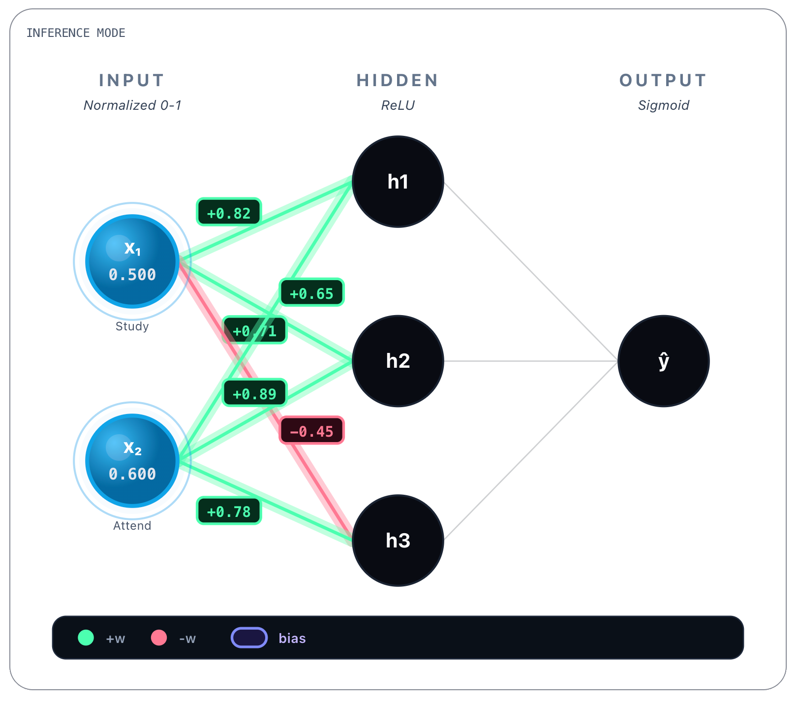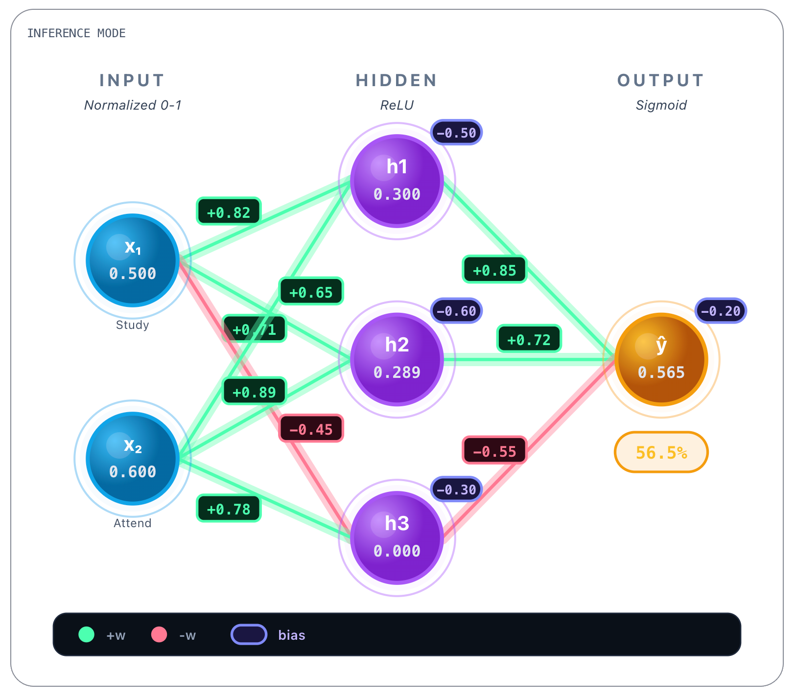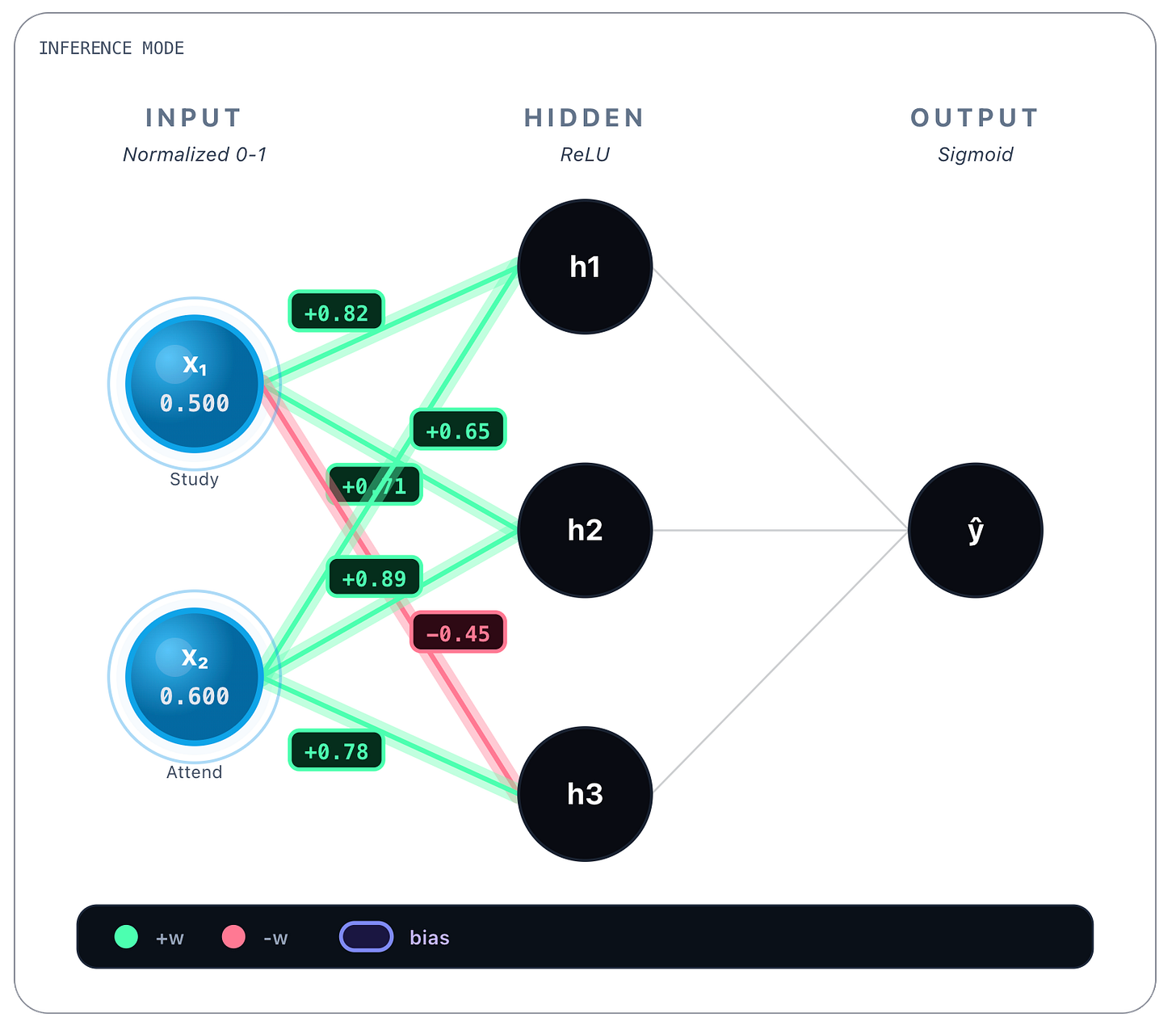 → h₃: w = 0.78These values were obtained during training and are static once the network is trained. Whatever the inputs, these values are always the same. Bias values are also learned and static, we show them next.