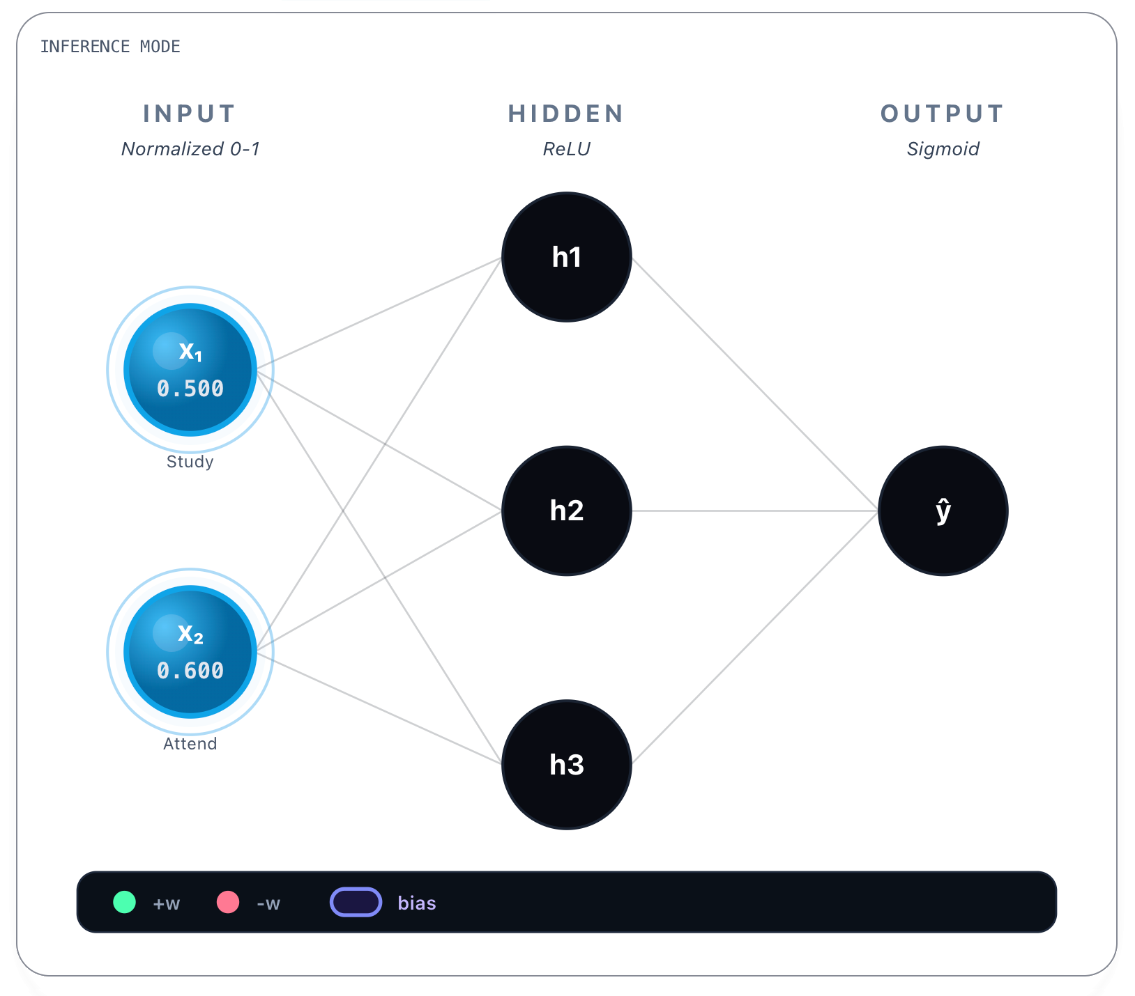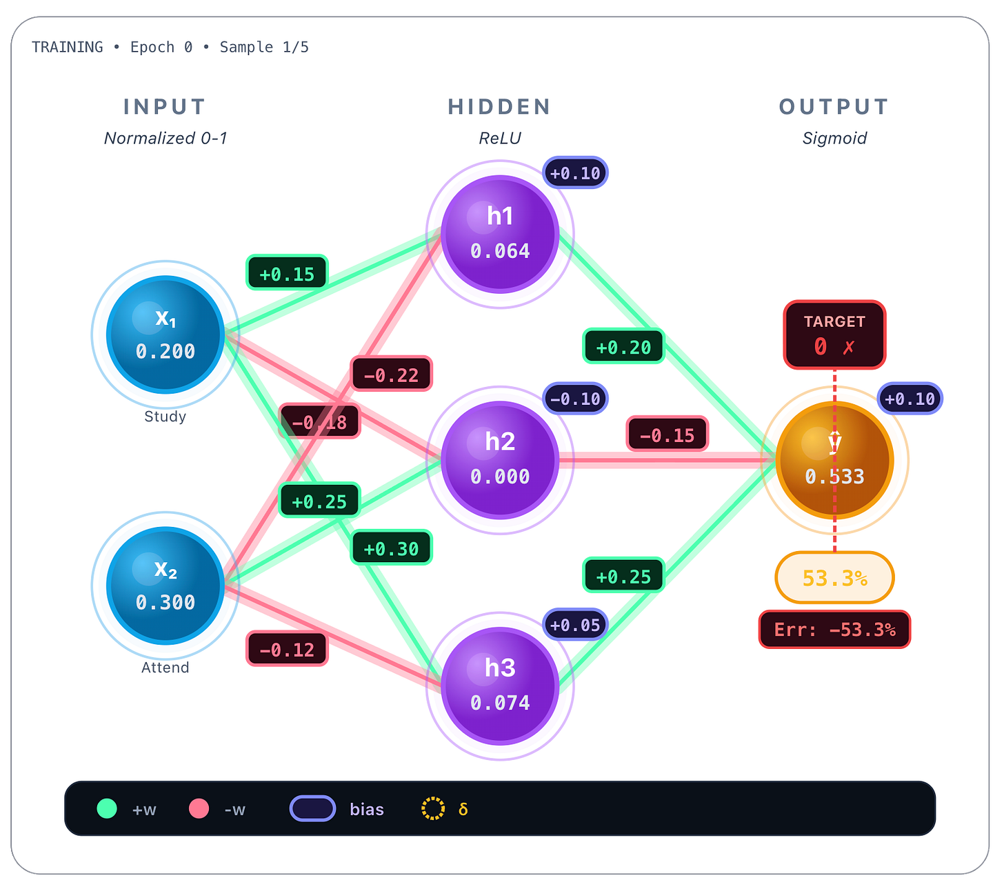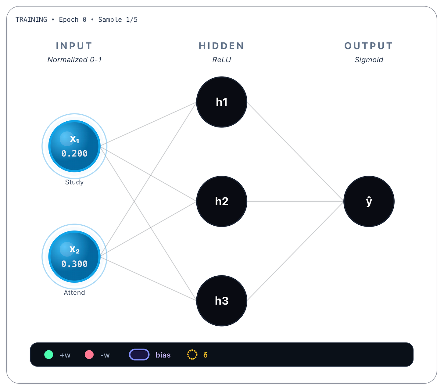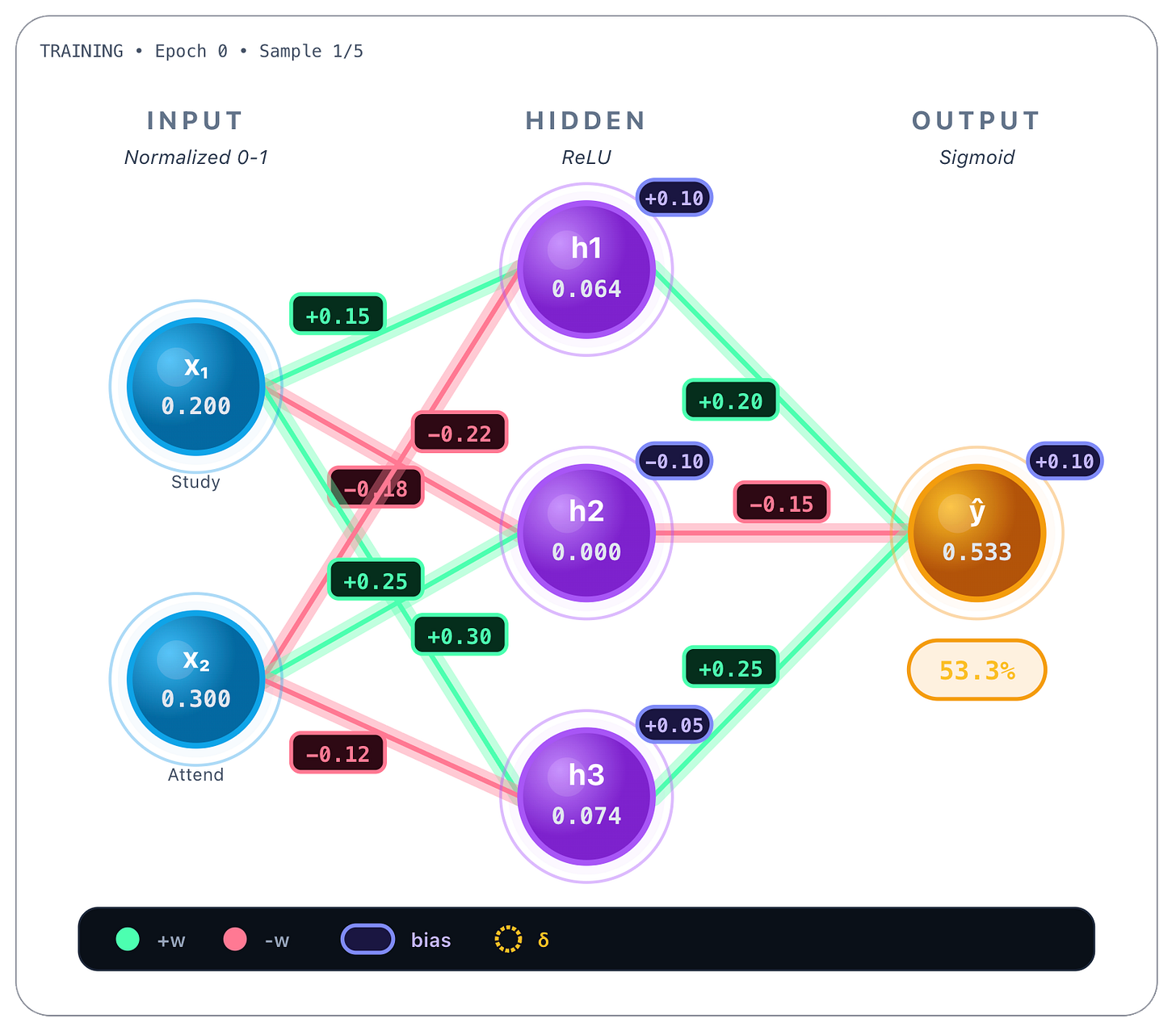 → h₃: w = 0.78These values were obtained during training and are static once the network is trained. Whatever the inputs, these values are always the same. Bias values are also learned and static, we show them next.