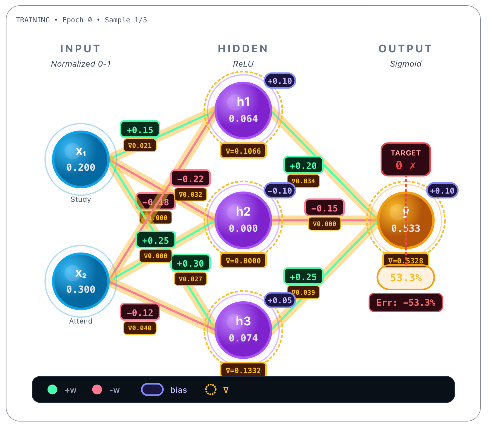 → h₃: w = -0.45From Attendance (x₂):