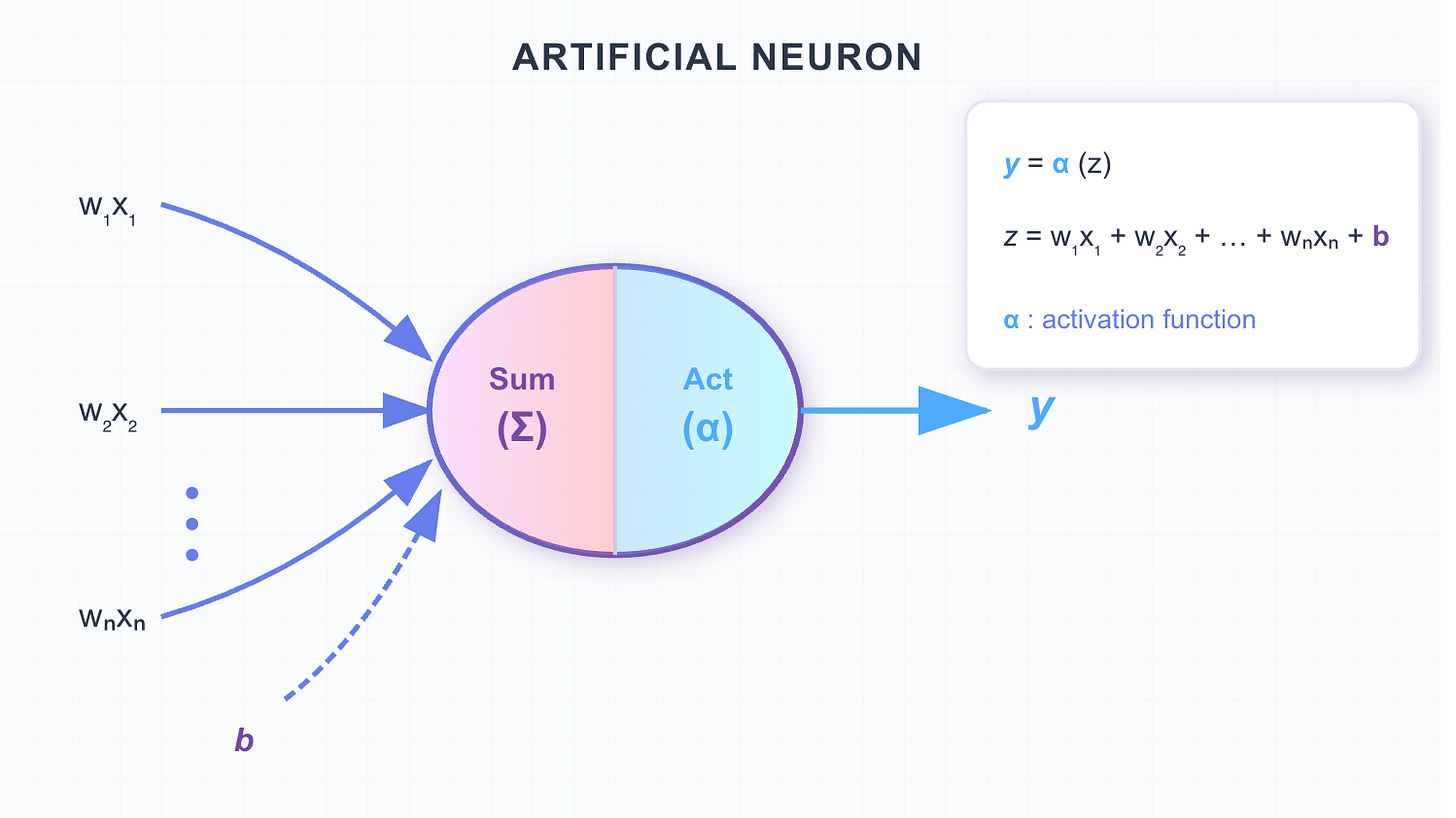 Weight: Determines the importance of each input feature. It acts as a slope, controlling how strongly the input influences the output.