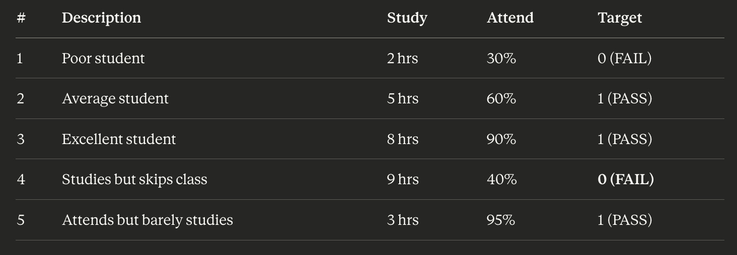 Here we see quite a few observations of the reality we are trying to model. We see a student that doesn’t study very much nor attends class (and inevitably fails the exam). We see an average student, an excellent student, and examples of both extremities: a student that studies but skips class, and vice-versa, one that attends but barely studies. If you notice, all of the cases have targeted observations: all have pass/fail outcomes. It’s as if this is an historical record of student behaviours and their respective exam outcomes. This is our observable reality, it’s by mining this list and showing to a network a comprehensive set of examples that try to describe in it’s more complete form the observable reality we want to model, that we effectively teach the network to discern the relation between hours of study, class attendance, and final exam outcome. And the network, with enough examples and training, will learn it automatically.