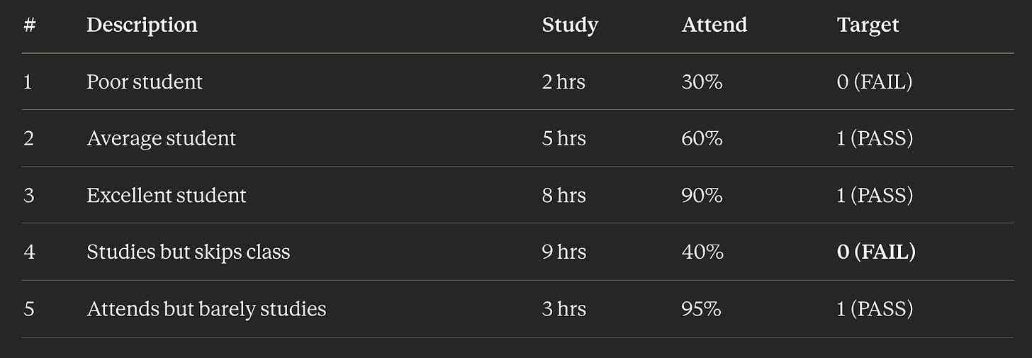 To go back to the same student problem we tackled before, consider this training dataset: